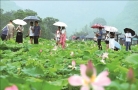 柳江区数百亩荷花绽放 游客雨中漫步赏花忙